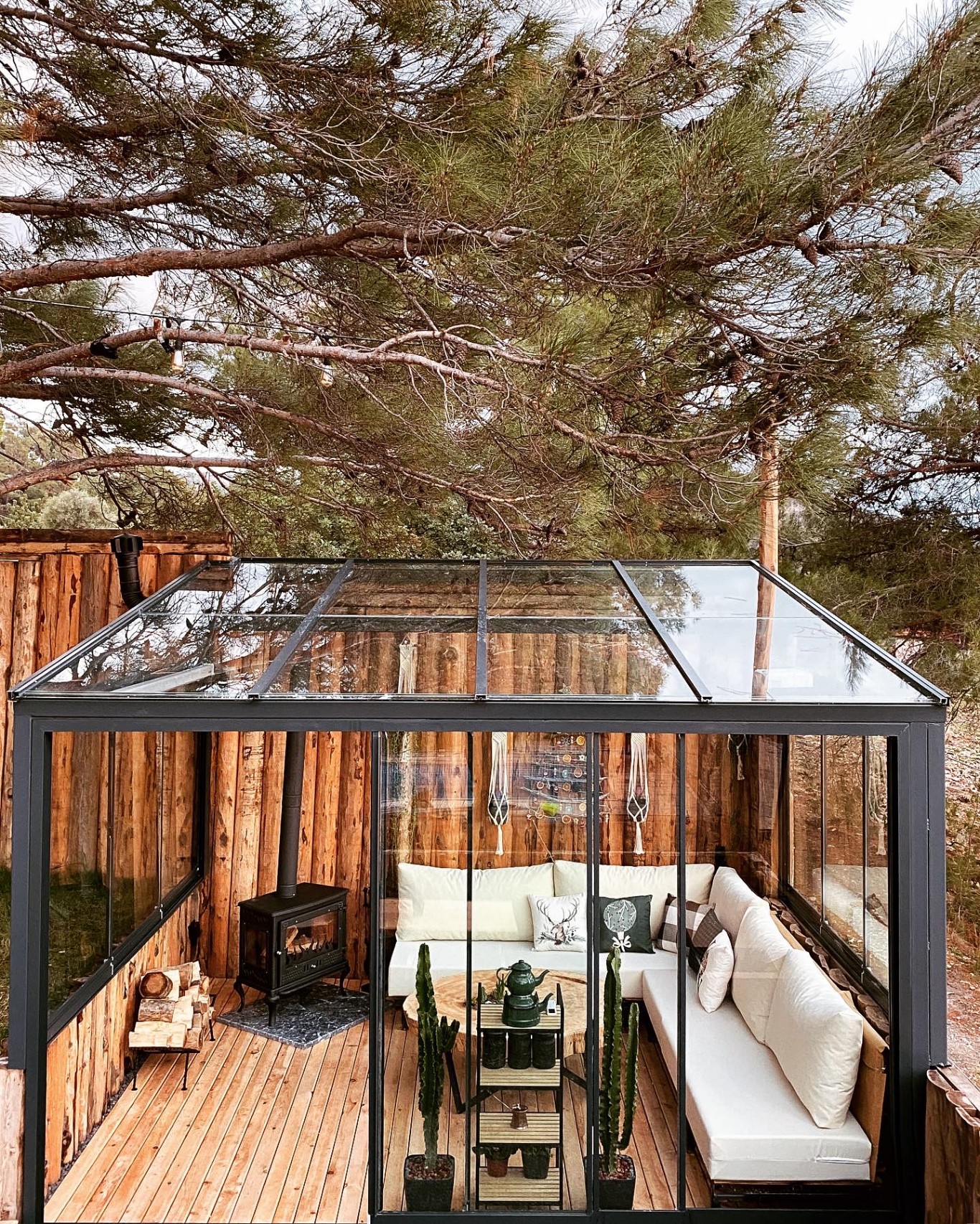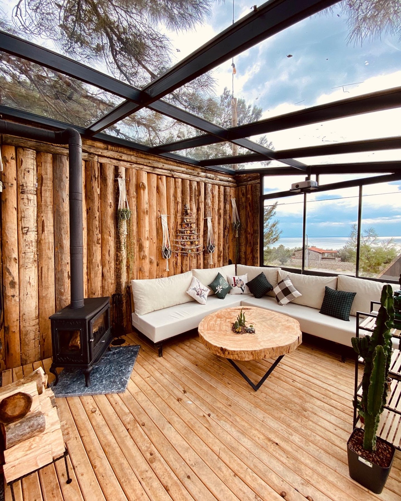 Tiny House Likya evlerimizin bazılarında, özenle hazırlanmış şömineli kış bahçesinde size çayınızı demleyip, patlamış mısırınızla sinema keyfi yapma imkanı sunuyor. Etrafı camlarla çevrili olan kış bahçesinde üstünüze yağan yağmurla birlikte, şömineden yayılan sıcaklik kış mevsiminin en güzel halini yaşatıyor.